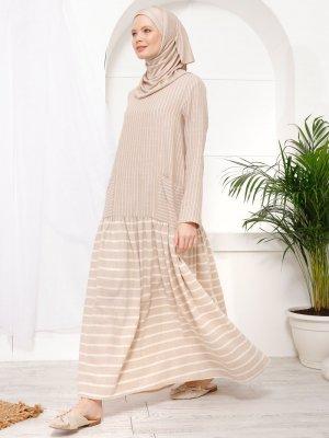 İnşirah Bej Çizgi Desenli Elbise