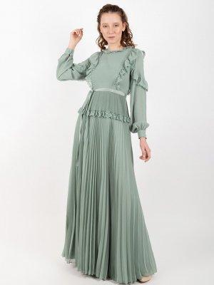 Puane Mint Piliseli Dantelli Şifon Elbise