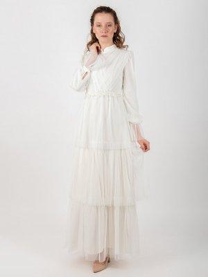 Puane Ekru Boncuk İşlemeli Tül Elbise