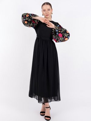 Loreen By Puane Siyah Çiçekli Balon Kol Elbise