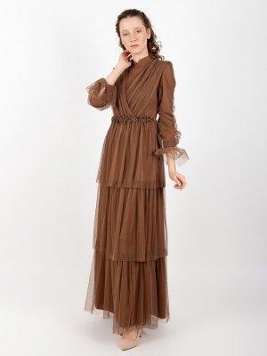 Puane Kahve Boncuk İşlemeli Tül Elbise