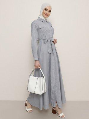 Refka Beyaz Lacivert Çizgili Desenli Elbise
