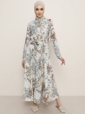 Refka Ekru Doğal Kumaşlı Desenli Elbise