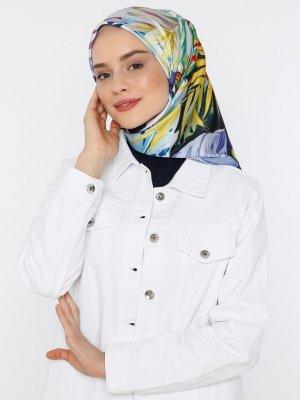 Tuva Şal Mavi Renkli El Boyaması Desen Twill Eşarp