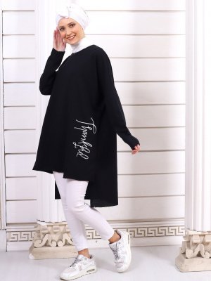 Por La Cara Siyah Etek Kısmı Kesik Yazı Detaylı Tunik