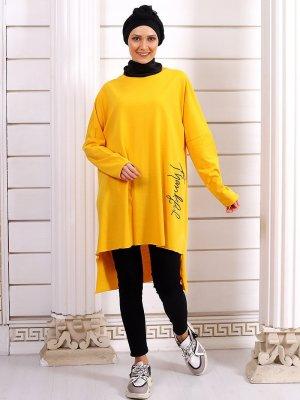 Por La Cara Hardal Etek Kısmı Kesik Yazı Detaylı Tunik