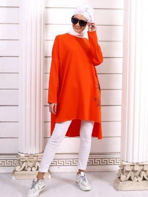 Por La Cara Kiremit Etek Kısmı Kesik Yazı Detaylı Tunik