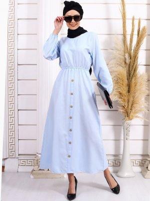 Por La Cara Bebe Mavi Beli Lastikli Düğmeli Elbise