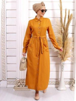 Por La Cara Hardal Koyu Boydan Düğmeli Cepli Elbise