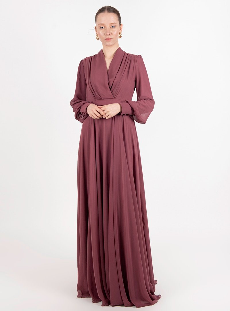 Puane Gül Kurusu Koyu Şal Yaka Şifon Elbise