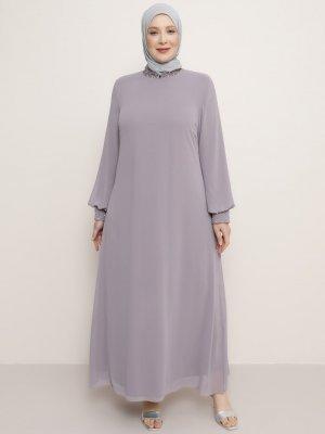 Alia Lila Toz Boncuk&Taş İşlemeli Abiye Elbise