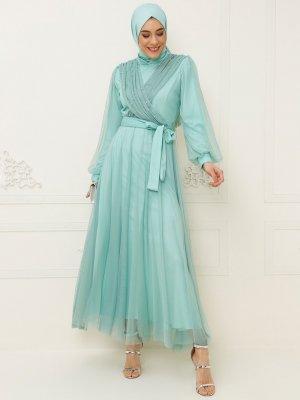 BÜRÜN Mint Tül Detaylı Abiye Elbise
