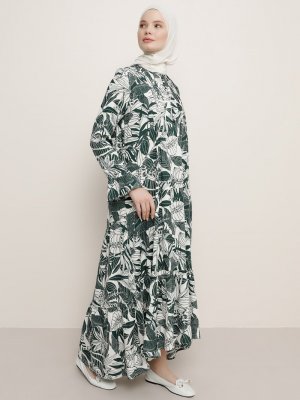 Benin Yeşil Tropik Volan Detaylı Brit Düğmeli Elbise