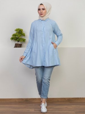 Pink Lady`s Mavi Bebe Cepli Keten Gömlek Tunik