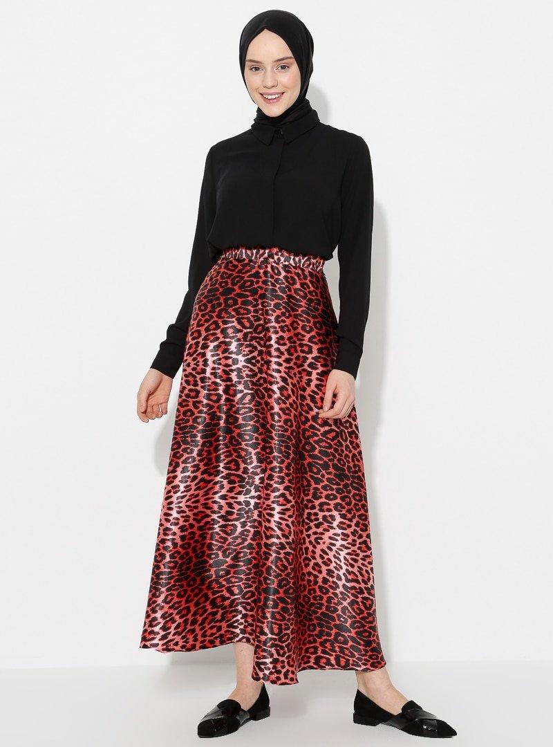 Almera Kırmızı Siyah Leopar Desenli Etek