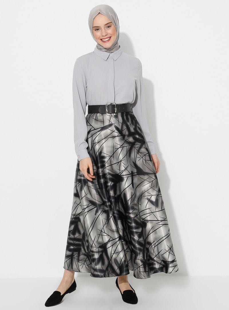 Almera Gri Siyah Çiçek Desenli Etek
