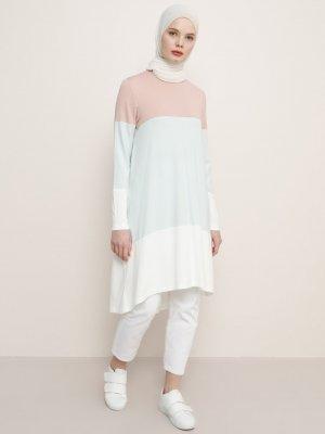 Benin Pudra Nil Yeşili Doğal Kumaştan Garnili Tunik