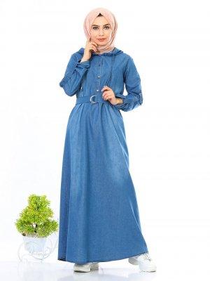 Pink Lady`s Mavi Açık Kol Apolet Kapüşonlu Kot Elbise