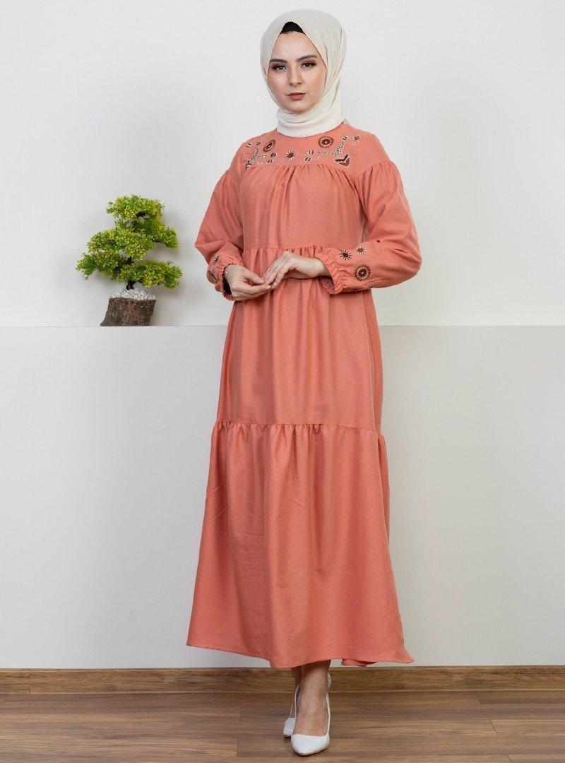 Pink Lady`s Somon Çiçek Nakışlı Katlı Elbise