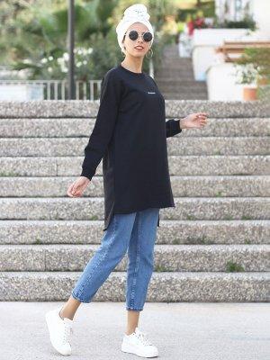 Por La Cara Siyah Önde Resever Yazılı Yırtmaçlı Tunik