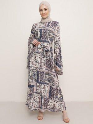 Refka Bej Mavi İspanyol Kollu Desenli Elbise