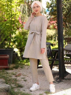 İnşirah Bej Çizgili Tunik&Pantolon İkili Takım