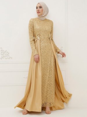 AYŞE MELEK TASARIM Altın Pelerin Aplikeli Abiye Elbise
