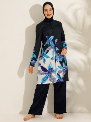 Mayo Bella Lacivert Beyaz Çiçek Desenli Tam Kapalı Mayo