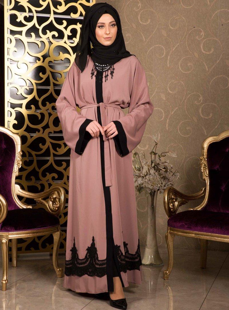İz Otantik Gül Kurusu Dantel Detaylı Ferace