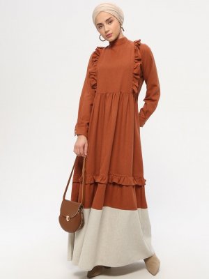 MisCats Bej Tarçın Volanlı Kontrast Elbise