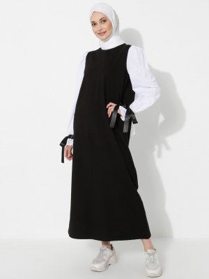 Peker Siyah Kolları Bağcıklı Garnili Elbise