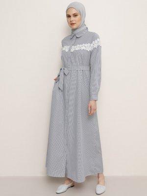 Benin Lacivert Nakış Detaylı Kuşaklı Elbise