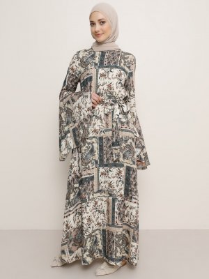 Refka Bej Kahverengi İspanyol Kollu Desenli Elbise
