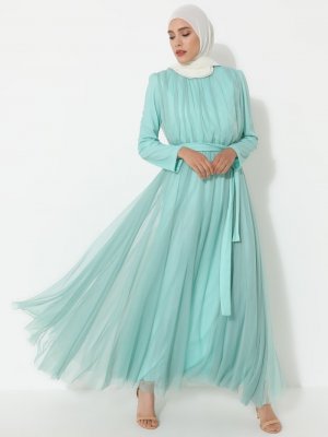 BÜRÜN Mint Beli Kuşaklı Tüllü Elbise