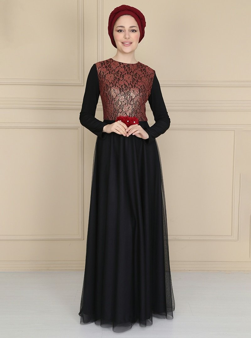 Asee`s Bordo Siyah Dantelli Çiçek Detaylı Kloş Abiye Elbise
