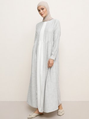 Refka Lacivert Çizgili Doğal Kumaşlı Elbise