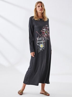 Muni Muni Antrasit Doğal Kumaşlı Baskılı Elbise