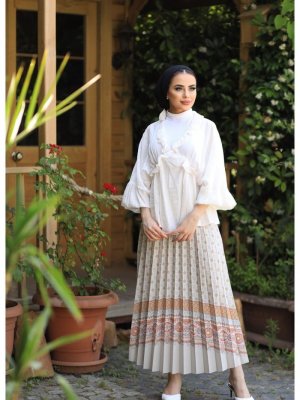 Elbica Bej Pliseli Dijital Bakılı Etek