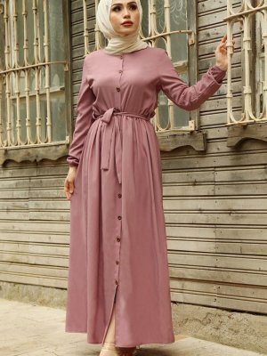 Festmoda Gül Kurusu Boydan Düğmeli Elbise