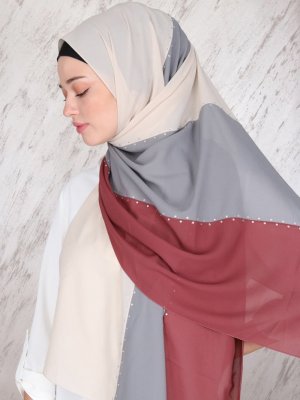 Soft Scarfs Gül Kurusu Gri Bej Üç Renkli Taşlı Mood Şal