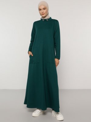 Refka Orman Yeşili Yakası Kuş Gözü Detaylı Cepli Elbise