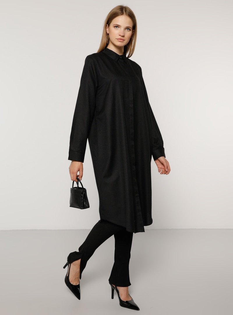 Alia Siyah Doğal Kumaşlı Gizli Düğmeli Tunik