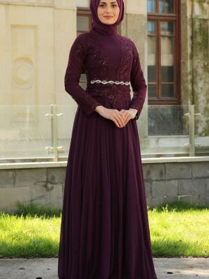 Feiza Collection Mürdüm Güpür Detaylı Kloş Etekli Abiye Elbise