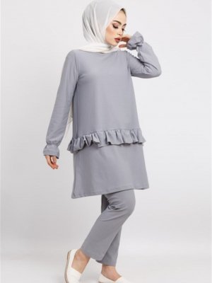 Moda Ekru Gri Pantolon Tunik İkili Takım
