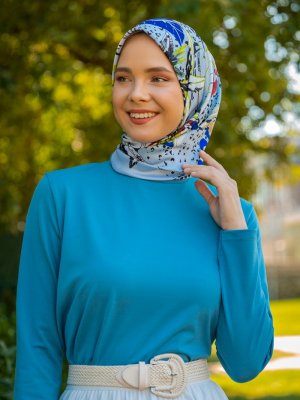 Tuva Şal El Boyaması Tasarım Twill Eşarp Mavi Renkli