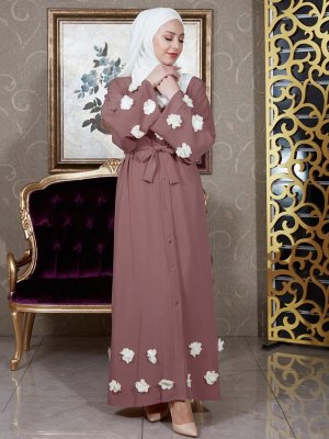 İz Otantik Pembe Koyu Çiçek Detaylı Çıtçıtlı Ferace
