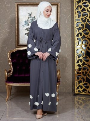 İz Otantik Gri Çiçek Detaylı Çıtçıtlı Ferace