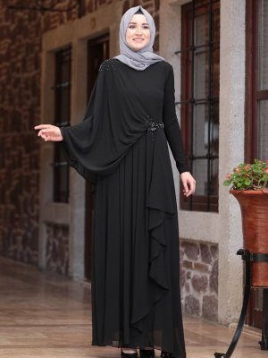 Amine Hüma Siyah Beli Taşlı Abiye Elbise