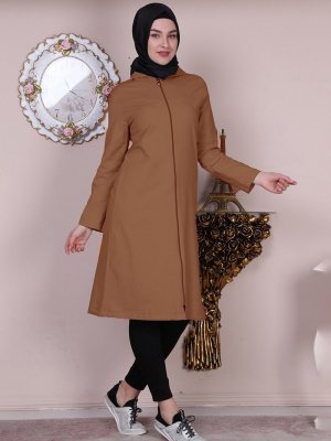 Night Blue Collection Karamel Boydan Fermuarlı Trençkot