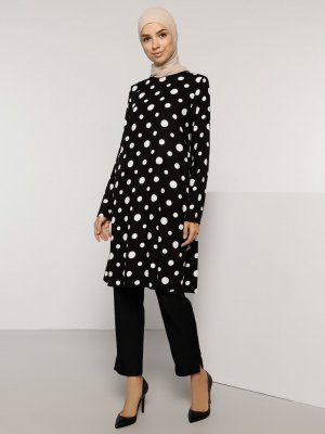 Tavin Siyah Doğal Kumaşlı Puantiye Desenli Tunik
